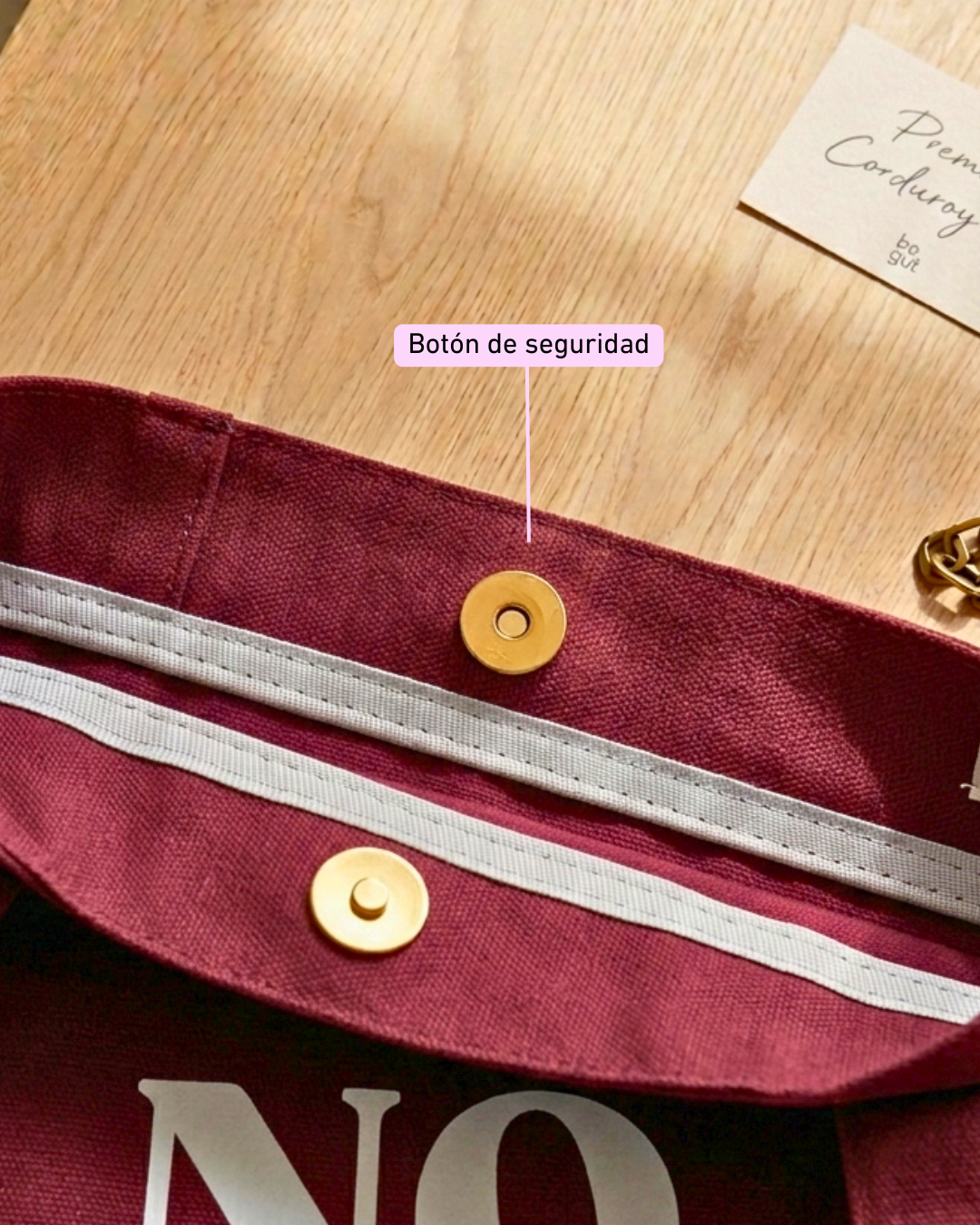 Hecha en tela tipo gamuza premium con tono vino profundo, lleva su botón de seguridad y refuerzo en sus costuras internas — elegante, sobria, poderosa — con tipografía celeste contundente que no pide permiso.